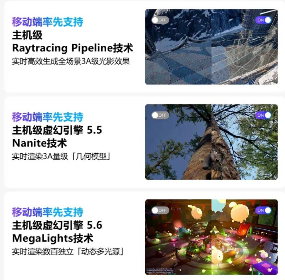 该芯片率先搭载全新GPU Dynamic Cache架构、移动端Raytracing Pipeline技术、天玑星速引擎-倍帧技术3.0等业界领创的图形处理技术,同时率先支持让画面效果更逼线 MegaLights和5.5 Nanite方案,以超乎想象的冷劲性能,为移动游戏提供行云流水的满帧流畅度、3A级震撼画质、广泛的生态合作优化,打造全球手游玩家喜闻乐见的主机级体验。